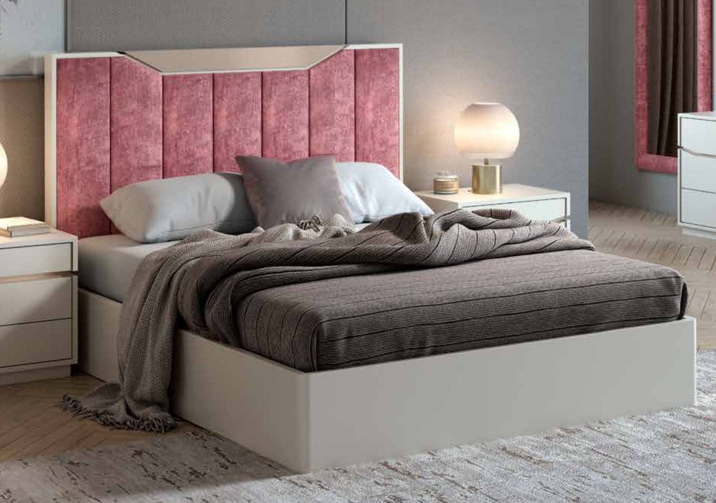 Cama Casal Gold Mor, cabeceira com revestimento em tecido e pés em Lacado Branco Mate.