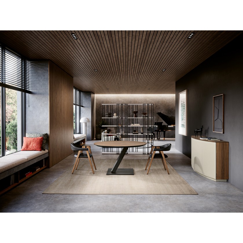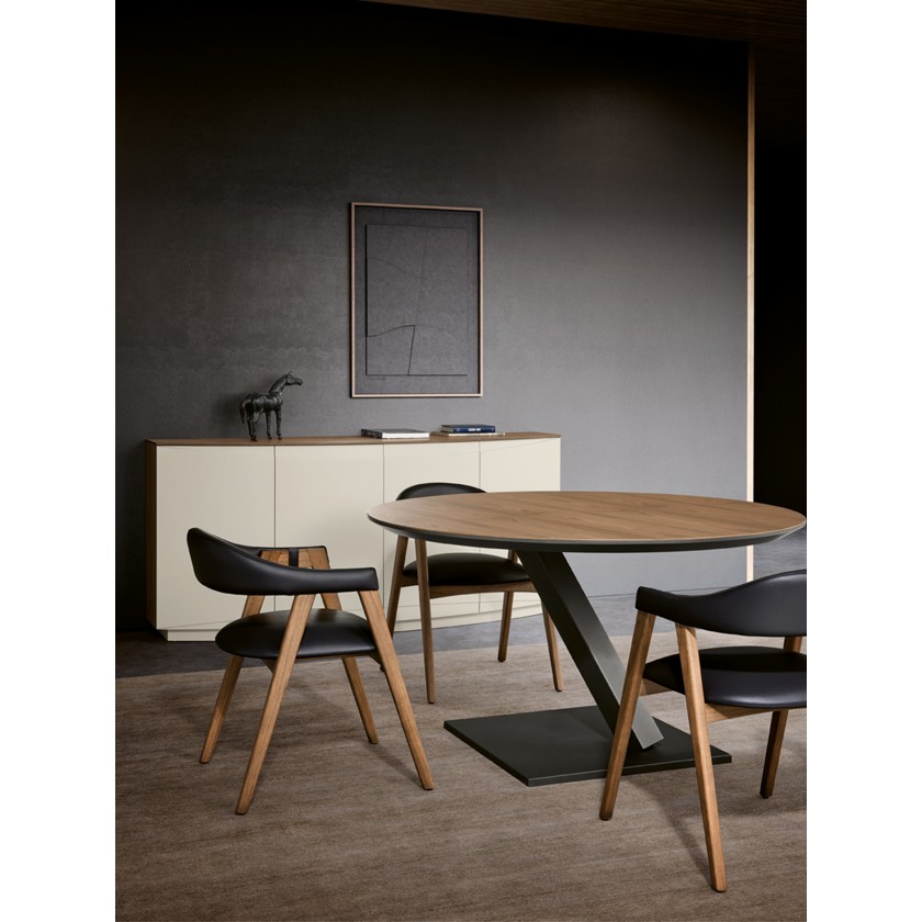 Mesa de Jantar Fixa. O tampo está lacado mate (LM30) com capa de Nogueira (NGN). Pé de ferro (FR05).